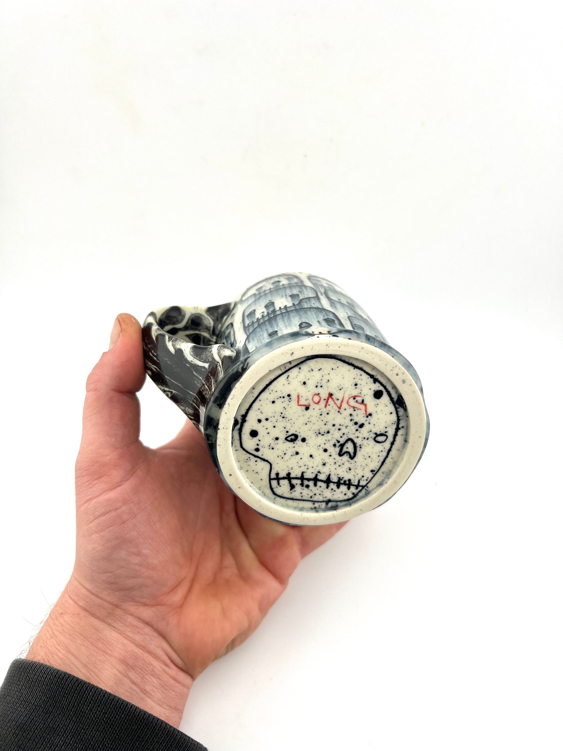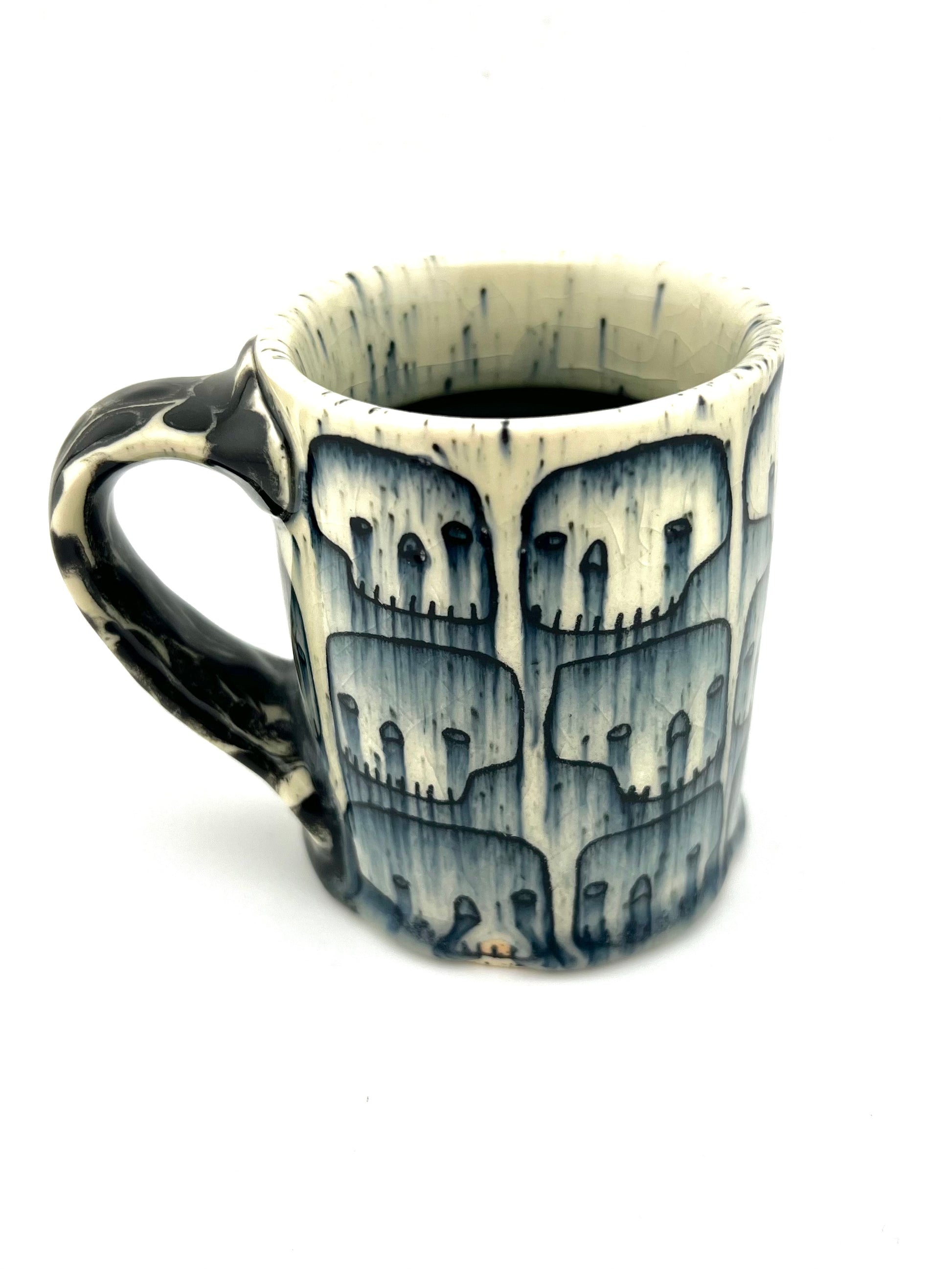 Wheel thrown porcelain mug with inlaid designs